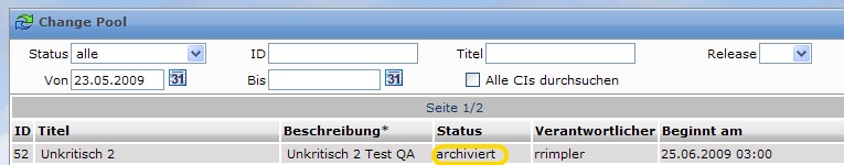 Der Change wird sodann automatisch in den Change-Pool zurückgestellt und in den Status archiviert gesetzt. Im Change-Pool können Sie ihn jederzeit wiederfinden und bei Bedarf wieder aufrufen: