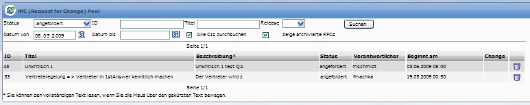 <note tip> Achtung: Sollte das „isPrivate“-Flag bei einem RfC gesetzt sein, kann ein Benutzer diesen RfC nur dann ansehen, wenn er das Recht Change.Manage besitzt, RfC-Owner oder diejenige Person ist, die den RfC angelegt hat (bzw. Freigebender oder Verantwortlicher ist). Ebenso braucht der eingeloggte Benutzer das Recht RfC.Display.Pool um die Liste anzeigen zu können.</note>